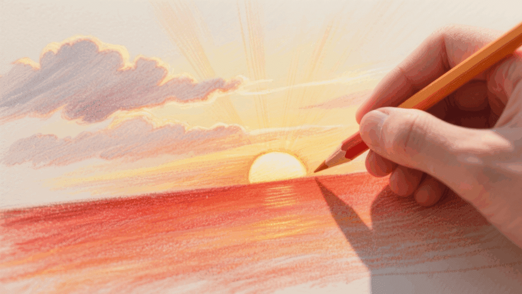 This style focuses on how the sun interacts with the atmosphere, creating soft edges, gentle rays that blend into surrounding clouds, and that magical glow that makes sunrise and sunset drawings feel alive and atmospheric.